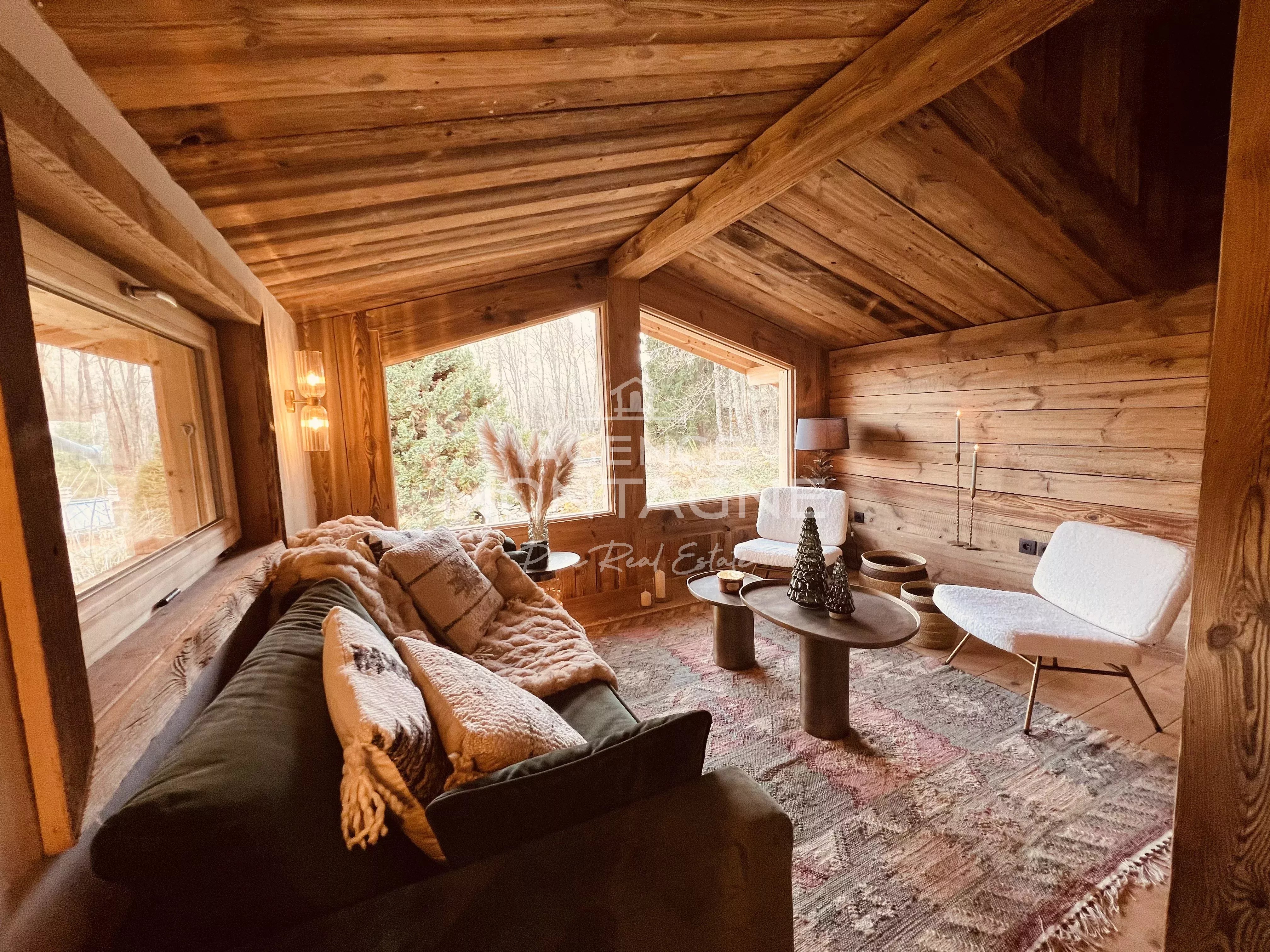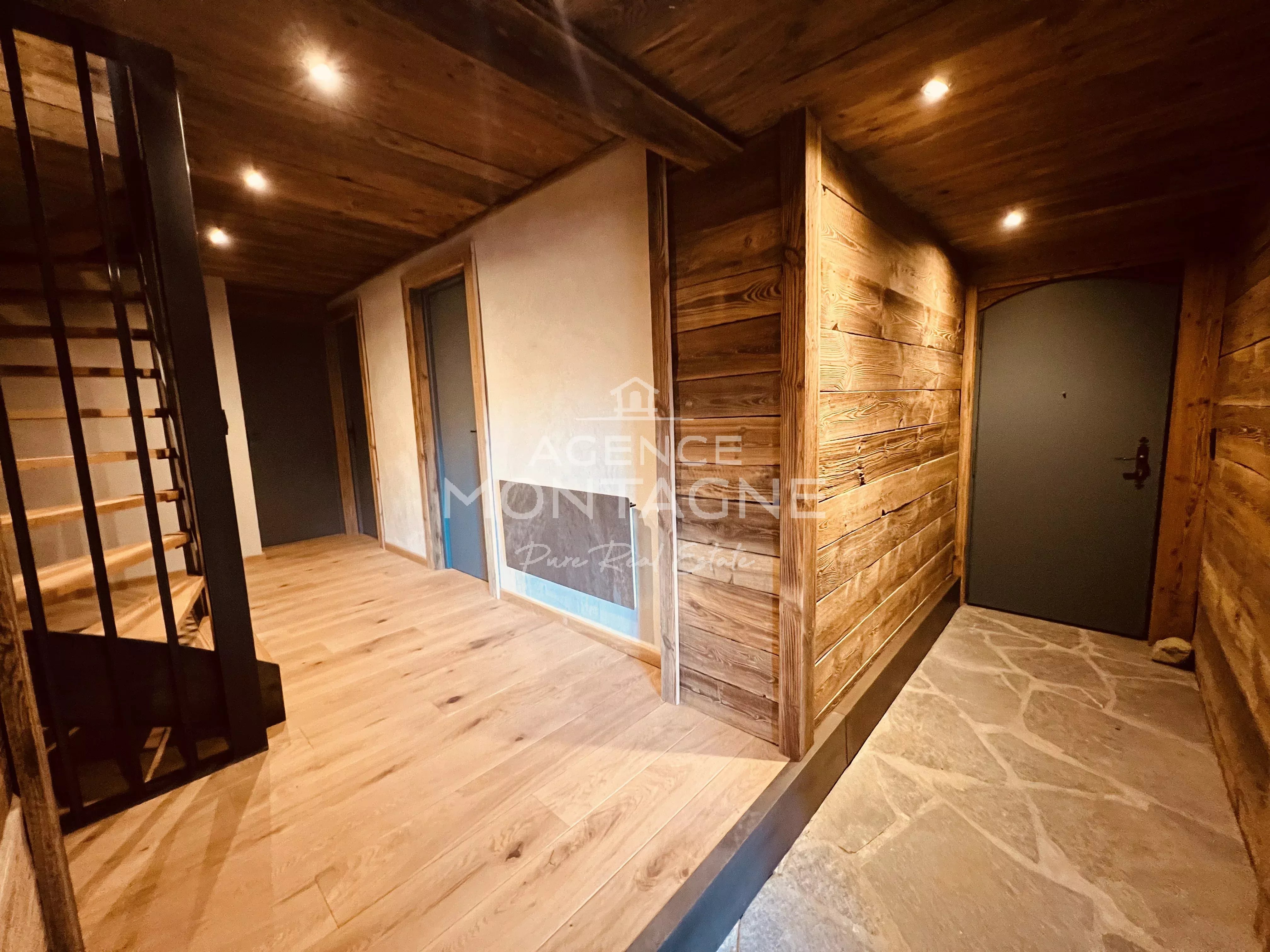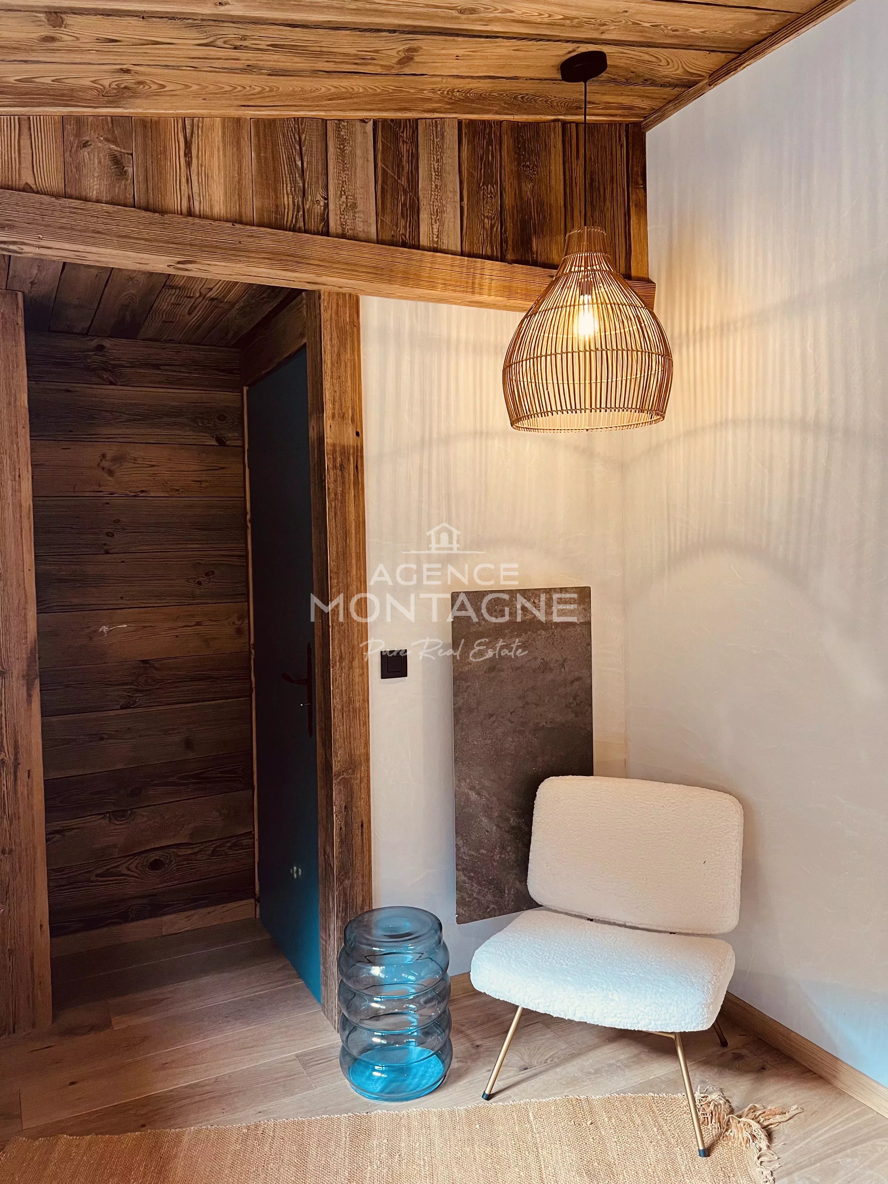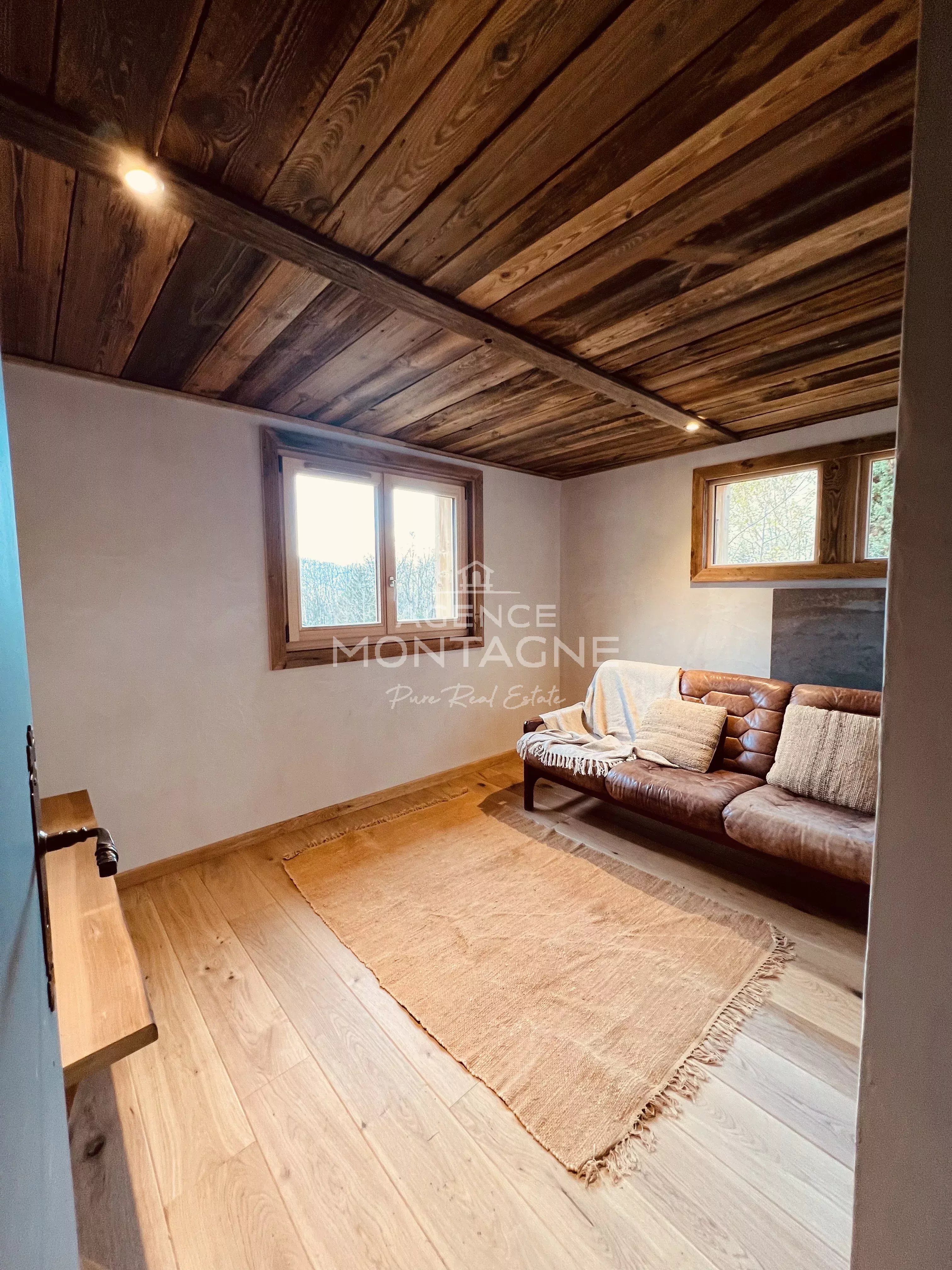 In the heart of Les Houches in a quiet and bucolic area, beautiful chalet completely renovated comprising on the ground floor, an entrance, a garage, an office, two double bedrooms, a bathroom with toilet, a laundry room, access to stairs (1st level).